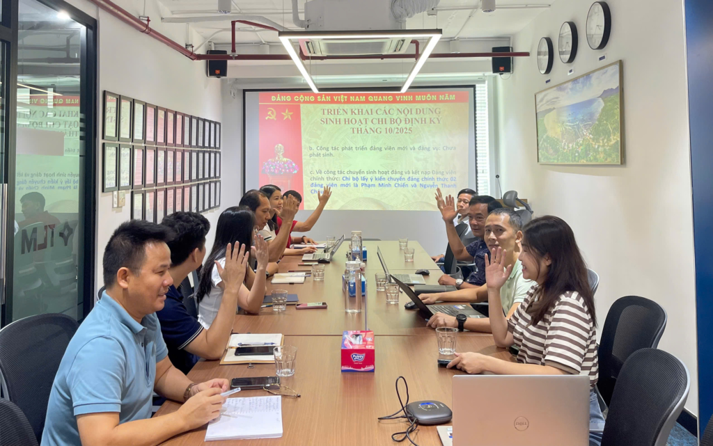Within the framework of the meeting, the Party cell also listened to a report on the implementation of production and business activities in September 2025; evaluate the results achieved, the remaining difficulties and limitations and propose solutions to overcome them. Party members discussed enthusiastically and contributed many ideas for the implementation of production and business tasks in October 2025. In addition, in the Party Cell meeting, 100% of the Party members attending the meeting agreed to officially transfer the Party to 02 probationary Party members Pham Minh Chien and Nguyen Thanh Chau.